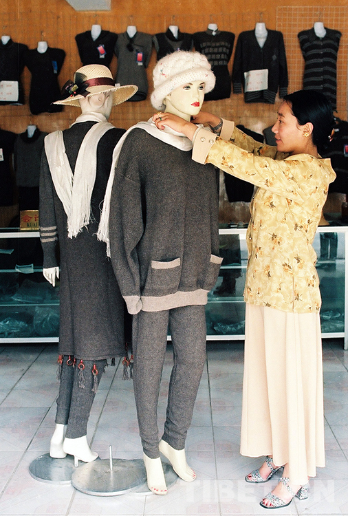 這是那曲地區(qū)(現(xiàn)那曲市)班戈縣絨毛分梳廠拉薩門市部經(jīng)理阿吉姆正在整理所經(jīng)銷的牦牛絨衫。由于牦牛絨衫相對(duì)于羊絨衫價(jià)格低、質(zhì)量好,在拉薩市場(chǎng)很受人們歡迎(唐召明1997年攝)
