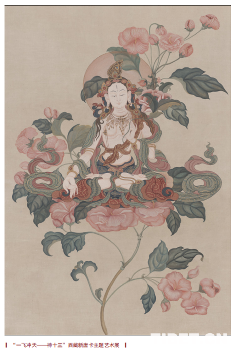 唐卡藝術(shù)家王天文所繪新唐卡《花與佛》則以女性特有的松活靈動,將工筆的花卉與白度母融合在一起,通過繪畫達成了新的意境……
