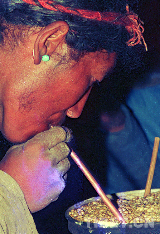 這是日喀則地區(qū)(現(xiàn)日喀則市)定日縣一牧民正在吸吮剛釀制好的青稞酒(唐召明1988年攝)