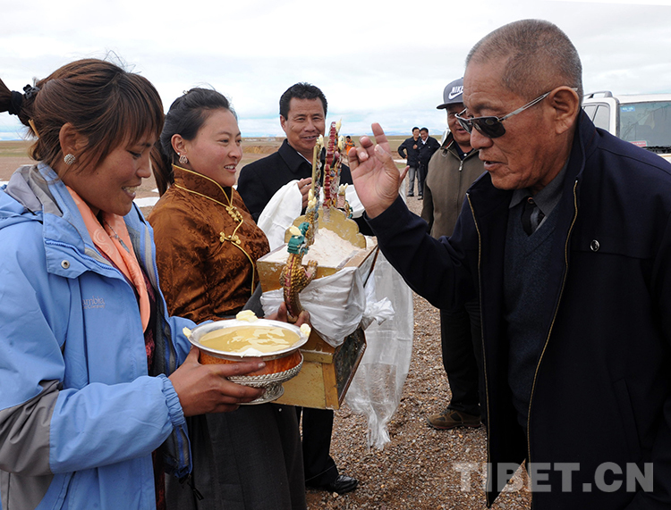這是那曲地區(qū)雙湖特別區(qū)(現(xiàn)那曲市雙湖縣)的青年在向來訪的老領導洛桑丹珍敬青稞酒(唐召明2013年7月25日攝)