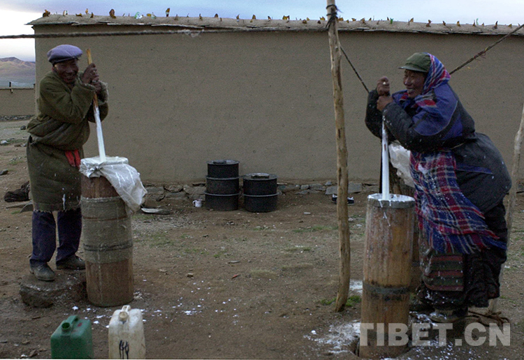 這是那曲地區(qū)雙湖特別區(qū)(現(xiàn)那曲市雙湖縣)嘎措鄉(xiāng)牧民正在打制酥油(唐召明2001年7月15日攝)