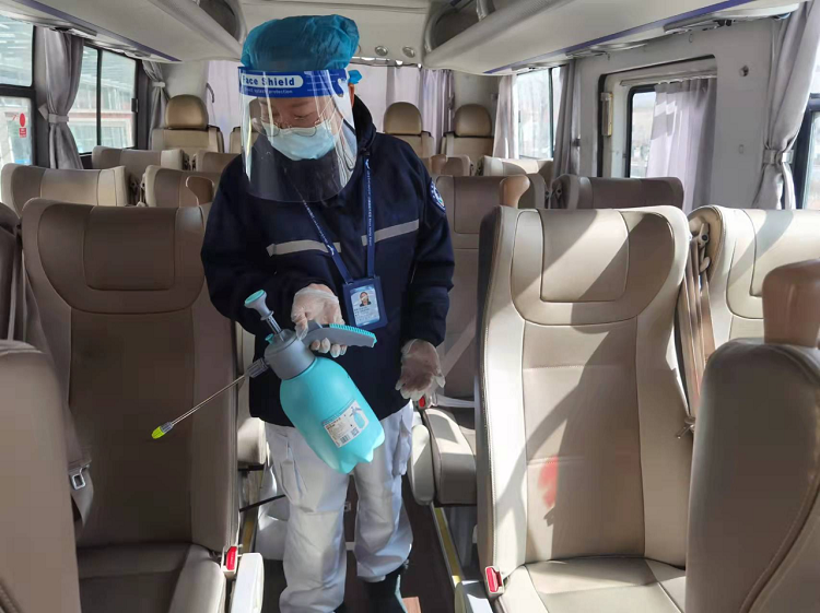 圖為達(dá)娃央金醫(yī)生在對(duì)旅客班車(chē)進(jìn)行消毒