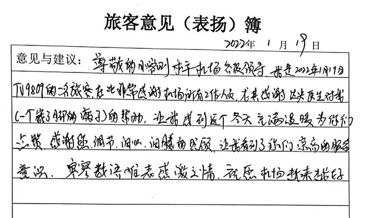 事雖小,但暖人心。數(shù)九寒冬的日喀則,室外冰雪連天,但達(dá)娃央金醫(yī)生這些服務(wù)舉措?yún)s讓張某感受到了春天般的溫暖。他便立即用旅客質(zhì)樸的語(yǔ)言書(shū)寫(xiě)了自己被幫助后的感動(dòng)之情。這也是日喀則航站在2022年收到的第二封感謝信。