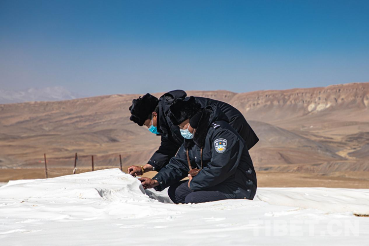 到達(dá)踏查點(diǎn),那里有一個(gè)由大小差不多的石頭壘起來、高50厘米左右的半圓形石堆,這就是他們踏查的避風(fēng)港。普瓊手執(zhí)國(guó)旗佇立在石頭上,嘎色拿出胸前的望遠(yuǎn)鏡,觀察四周有無異樣。風(fēng)不停地襲擾,但他們就像雕塑一樣,誓死捍衛(wèi)著腳下的領(lǐng)土。