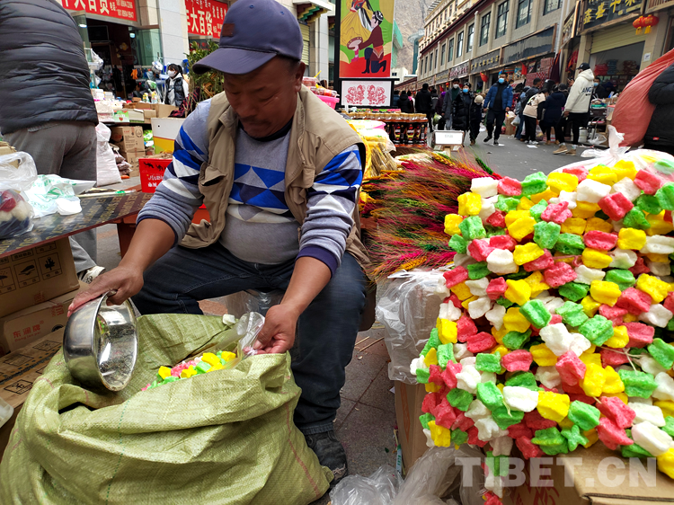 拉巴頓珠正忙碌著擺售賣(mài)年貨。喧鬧聲、音樂(lè)聲交織在一起,奏響了迎接新年的華美樂(lè)章。拉巴頓珠告訴記者,賣(mài)自家制作的年貨有幾天了,生意好得很。