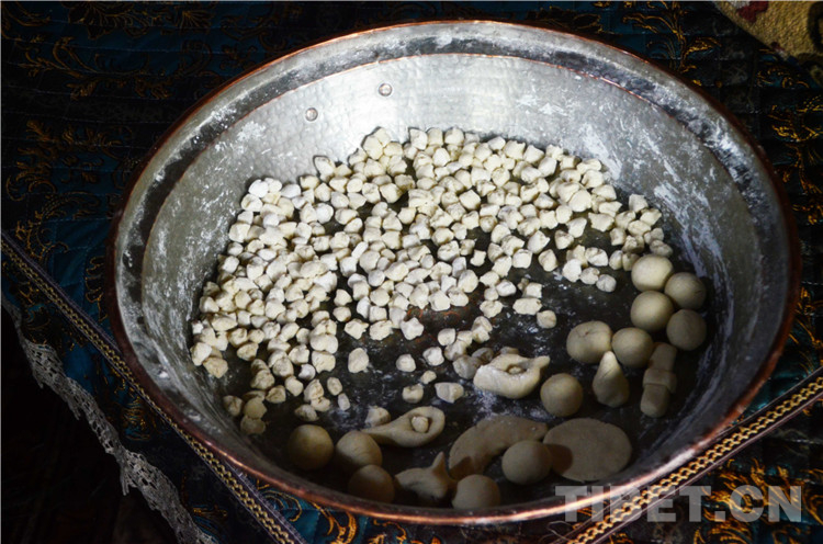 估量著量差不多夠一家人吃后,就開(kāi)始準(zhǔn)備晚上的重頭戲——在面團(tuán)中包入辣椒、羊毛、木炭等物品,就像春節(jié)時(shí)餃子里的硬幣一樣,古突中包入的物品也有著不同的意義。比如白羊毛寓意性情溫和,辣椒寓意牙尖嘴利等。同時(shí)還捏出了太陽(yáng)、月亮等形狀的面團(tuán),也都有著吉祥美好的寓意。