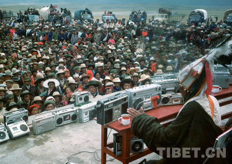 這是說唱藝人阿達(dá)在那曲賽馬會(huì)上說唱“格薩爾”的傳奇故事(才龍1987年攝)