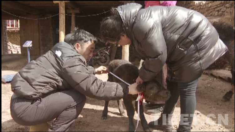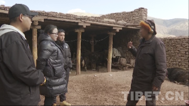 圖為貢覺(jué)縣畜牧站工作人員給村民索朗桑布指導(dǎo)飼養(yǎng)保暖措施