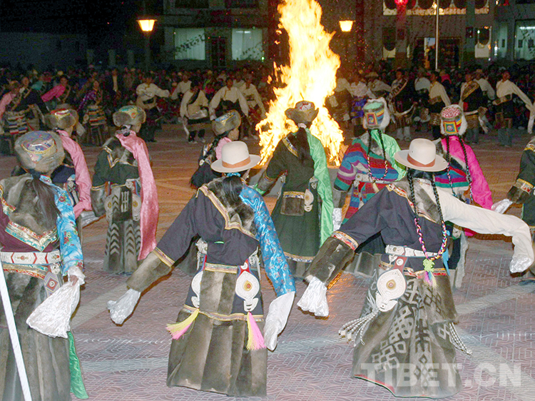 這是那曲地區(qū)雙湖特別區(qū)(現(xiàn)那曲市雙湖縣)牧民群眾在“撤區(qū)建縣”慶祝大會(huì)活動(dòng)中,圍著篝火跳起歡樂的“鍋莊”舞(唐召明2013年攝)