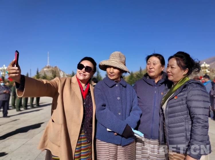 圖為參加“升國旗、唱國歌”儀式的群眾拍照留念 攝影:拉姆