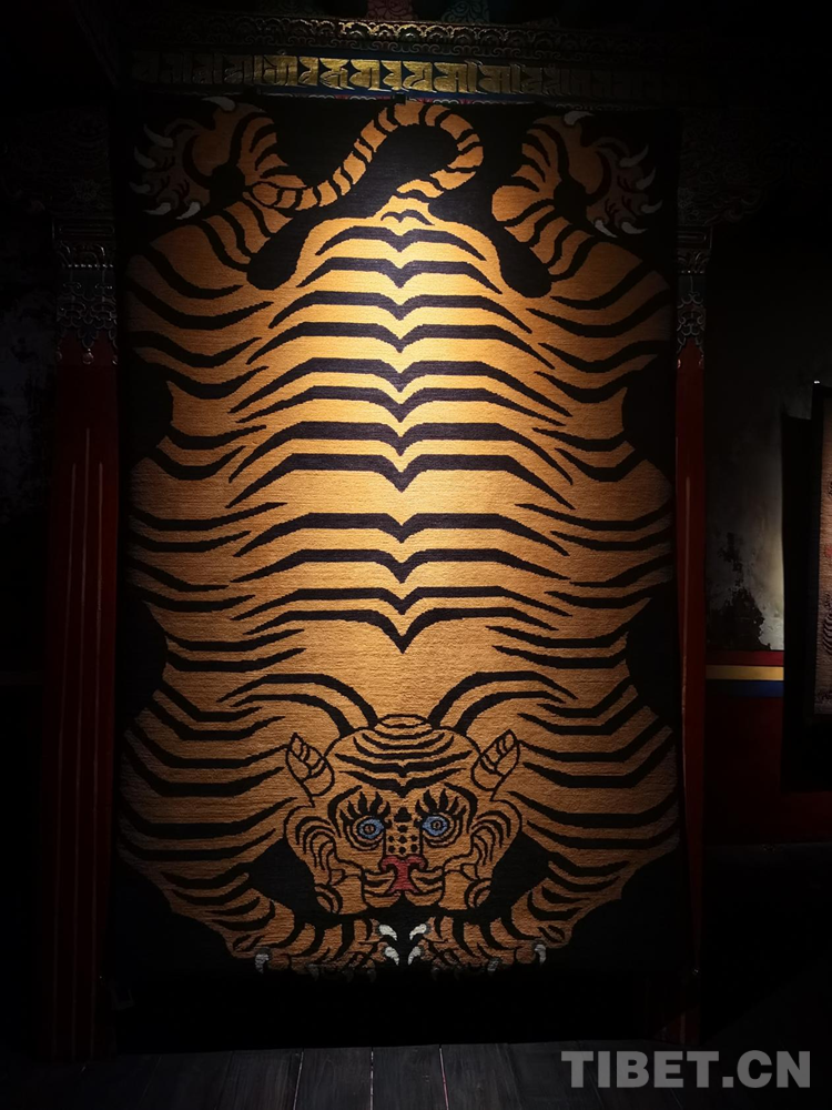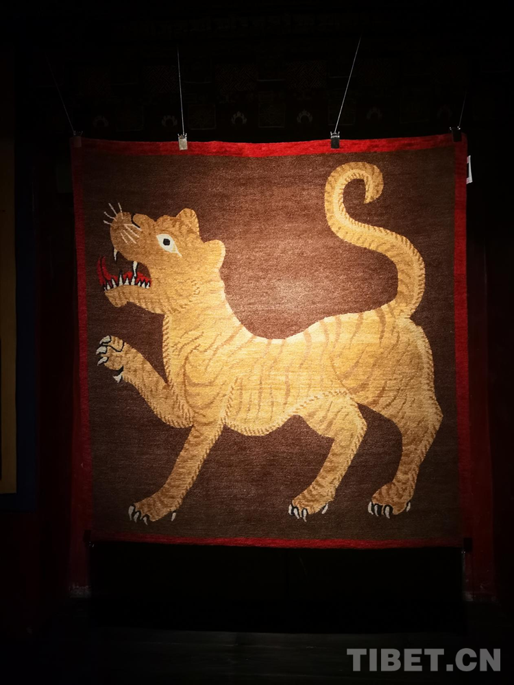 生活在不同地區(qū)的中華民族先民們都不約而同地有著對虎的崇拜和描繪。據(jù)了解,“云從龍,風(fēng)從虎”在中國古代先秦時(shí)期,虎一度與龍并列而成為權(quán)力和力量的象征。根據(jù)相關(guān)文獻(xiàn)記載,早在5000年前,西藏阿里地區(qū)的居住者就將虎皮紋飾等符號刻在巖石上;公元7世紀(jì)前后,松贊干布曾頒布《三十六制》,提到“虎皮褂、虎皮裙、虎皮袍”等成為“六勇飾”,只有獲得地位和相當(dāng)成就的人才能佩戴,虎的圖案也自此融入地毯等西藏織物中。