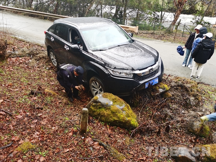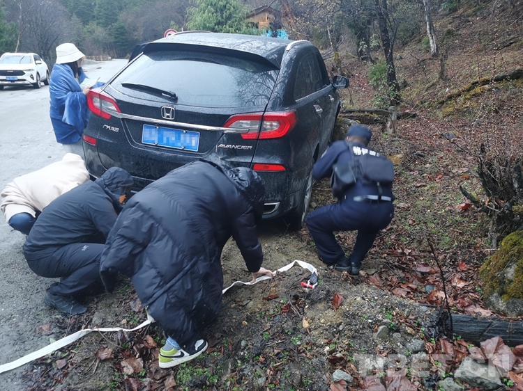“我們是第一次遇到這種情況,不知道怎么辦,只有請求你們幫助!”當?shù)亟诮涤贻^多、道路濕滑,兩名廣東籍女游客在南伊風(fēng)景區(qū)內(nèi)游玩返回途中操作不慎,導(dǎo)致車輛發(fā)生側(cè)滑,撞在路邊石頭上,無法自行脫困。不熟悉當?shù)厍闆r的游客,在雨中焦急無助,撥打報警求助。
