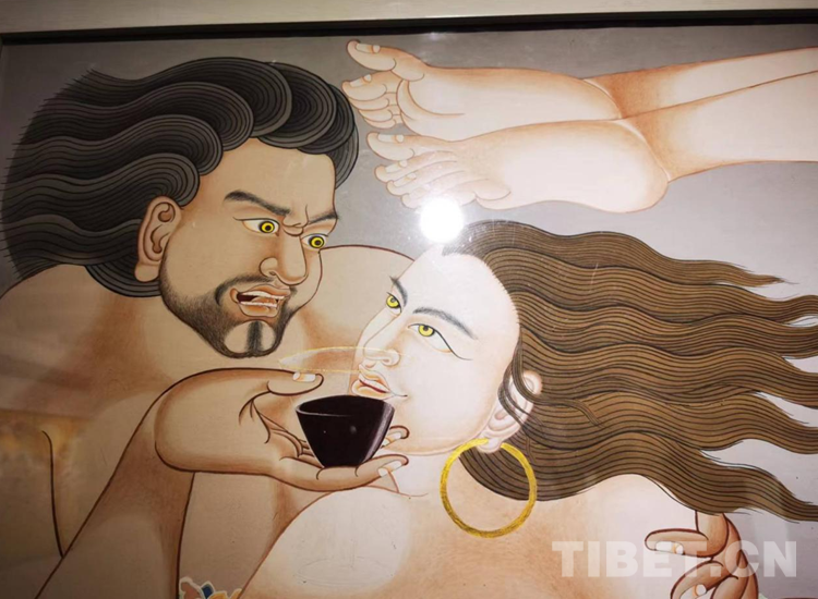 畫展特別展出了邊巴旺堆人物風(fēng)情“四季”,以傳統(tǒng)的欽孜派唐卡藝術(shù)繪畫表達(dá)了春夏秋冬自然民俗風(fēng)情,并以刻畫人物為個性特征,表達(dá)人一生經(jīng)歷的生老病死。視覺的沖擊力讓繪畫作品更具藝術(shù)感染力,表現(xiàn)了高原人對大自然和生命的祟敬?!版?zhèn)魔圖”作品以西藏“鎮(zhèn)魔圖”傳說為繪畫基礎(chǔ)進(jìn)行了探索性創(chuàng)作,通過四幅作品顯現(xiàn)西藏幾十年來這片高天厚土發(fā)生的翻天覆地的變化,也表達(dá)了藏傳佛教健康發(fā)展的愿望,繪畫作品在藝術(shù)手法上,色彩厚重絢麗,濃郁的傳統(tǒng)和現(xiàn)代繪畫完美融合,作品對末來充滿了想象,給每位觀眾帶來不同的藝術(shù)享受。作品“三毒”繪畫藝術(shù)創(chuàng)作,通過藝術(shù)繪畫作品直觀、具體、形象地批判社會發(fā)展中的不雅享樂追求。三組11幅邊巴旺堆階段性的代表作品,不同的傳統(tǒng)繪畫形式展示了欽孜派唐卡藝術(shù)之美。