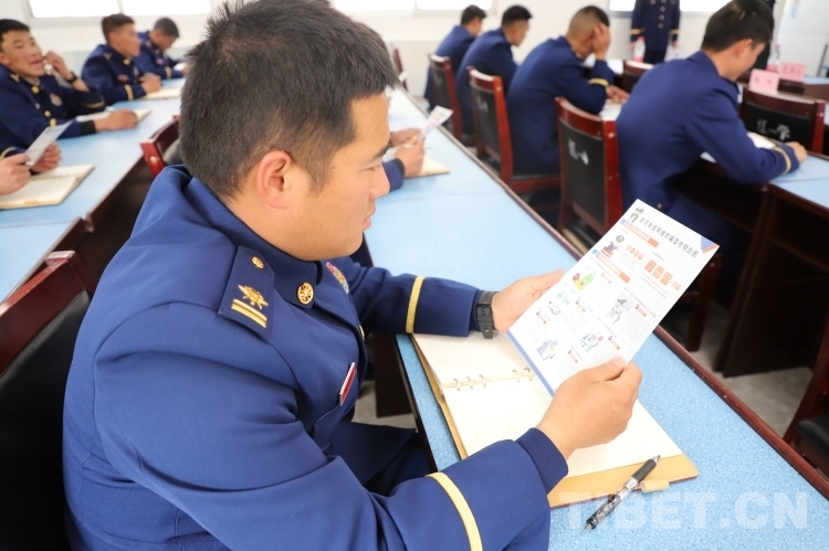 圖為該中隊(duì)隊(duì)員認(rèn)真閱讀防范電信網(wǎng)絡(luò)詐騙宣傳手冊(cè)