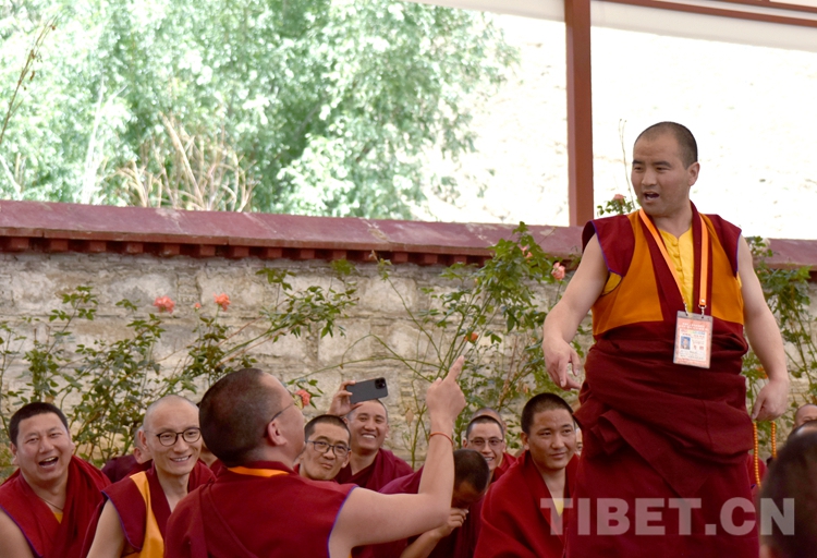 中國西藏網(wǎng)訊 身穿絳紅色袈裟,坐者仔細(xì)聆聽、站立者臂套念珠、迸出佛學(xué)妙語;圍觀者不時大笑……這是6月21日下午記者在西藏佛學(xué)院辯經(jīng)場看到的“唇槍舌戰(zhàn)”。