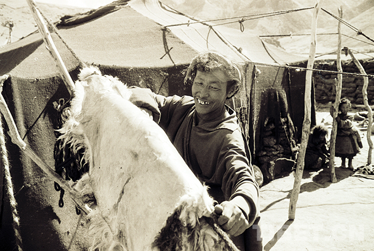 這是班戈縣一位牧民在帳篷外的牛毛繩上晾曬羊皮(唐召明1987年攝)