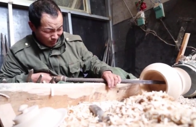 圖為拉郊鄉(xiāng)村民在制作木器