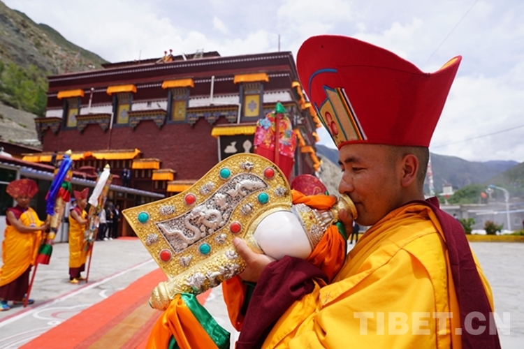 10時(shí)許,班禪抵達(dá)扎果寺。頓時(shí),法號(hào)長(zhǎng)鳴,鼓樂(lè)喧天,第六世德珠?加央西繞班旦活佛及僧眾以最隆重的宗教禮儀歡迎班禪的到來(lái)。