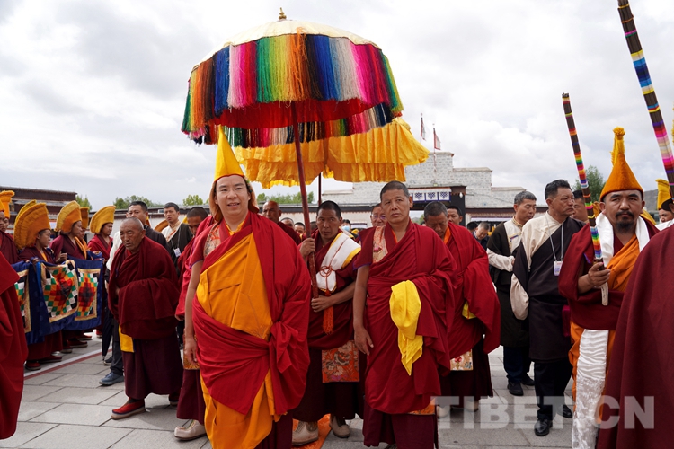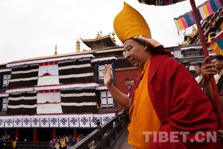 班禪抵達(dá),現(xiàn)場桑煙繚繞,法號聲悠長,扎什倫布寺僧眾以藏傳佛教最高禮儀迎接班禪。現(xiàn)場等候班禪的信教群眾紛紛摘帽行禮或雙手合十,向班禪的到來表示熱烈歡迎,班禪見狀揮手致意、送上祝福。隨后,班禪在手持黃傘、香爐的高僧引領(lǐng)下緩緩步行至措欽大殿。