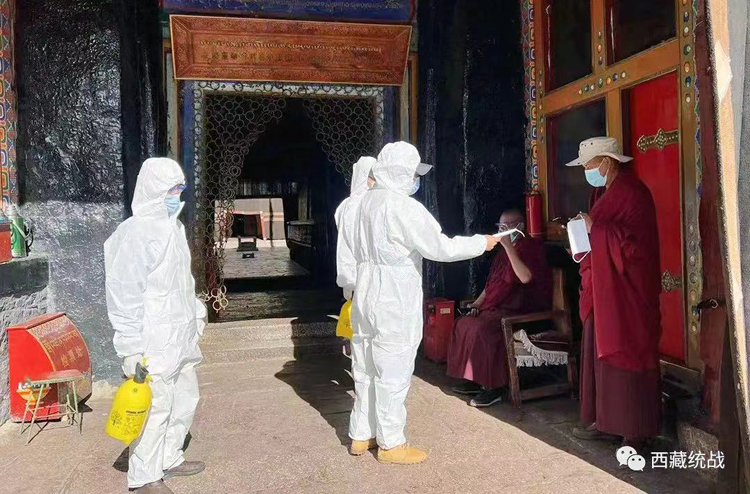 圖為西藏自治區(qū)日喀則市薩迦寺管委會(huì)在寺廟內(nèi)開展疫情防控工作 圖片來源:西藏統(tǒng)戰(zhàn)微信公眾號(hào)