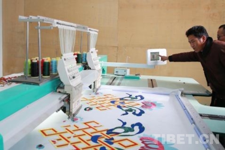 洛隆縣博織利民服飾有限公司老總向巴操作電子刺繡機(jī)刺繡帳篷上的圖案。陳衛(wèi)國(guó)攝
