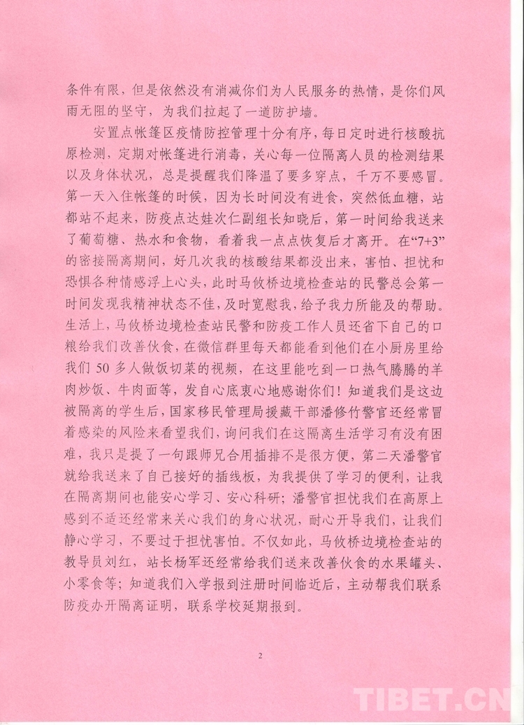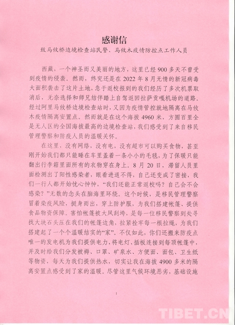 中國西藏網(wǎng)訊 “感謝逆流而上的你們!盡管有些人未曾謀面,我也看不到你們疲憊的面容,但在我心中,馬攸橋邊境檢查站移民管理警察,就是我在西藏的親人們,是我們眼中的大英雄們!”這段感人肺腑的言語來自西藏出入境邊防檢查總站阿里邊境管理支隊馬攸橋邊境檢查站臨時安置點馬攸木2名博士的一封感謝信。