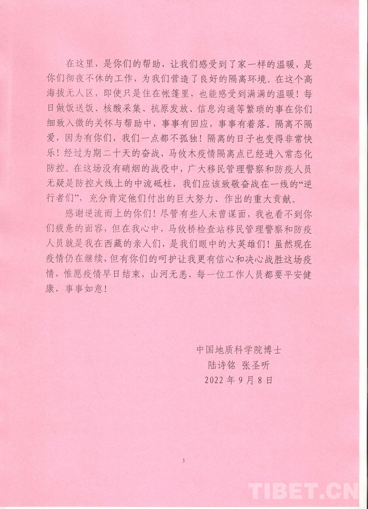 一次次走訪,一件件回應……這一系列真實、暖心的舉動,讓馬攸橋邊境檢查站的民警與滯留群眾建立了深厚情誼,也讓2人滯留結(jié)束回到北京后,寫下了這封感謝信。陸詩鳴、張圣聽的真情流露,飽含著群眾對馬攸橋邊境檢查站民警的信任,讓這個海拔4900多米的臨時安置點顯得更加溫暖。(中國西藏網(wǎng) 通訊員/張拴根 唐彪 記者/次旦拉姆 馬攸橋邊境檢查站供圖)