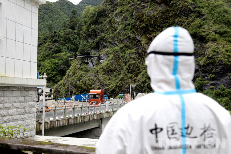 圖為民警正在使用無人機(jī)對貨運(yùn)通關(guān)現(xiàn)場進(jìn)行實(shí)時監(jiān)測 攝影:尼瑪?shù)┰?/p>