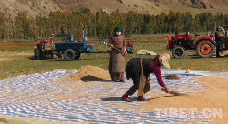 圖為雪鄉(xiāng)扎西崗村村民在曬青稞