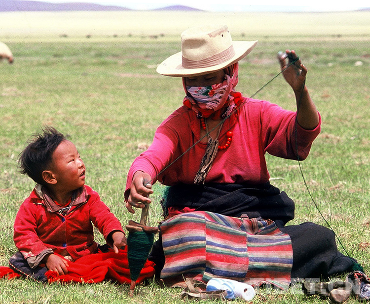 這是一位帶著孩子在藏北草原上邊放牧,邊捻牛毛線的牧女(唐召明1987年攝)