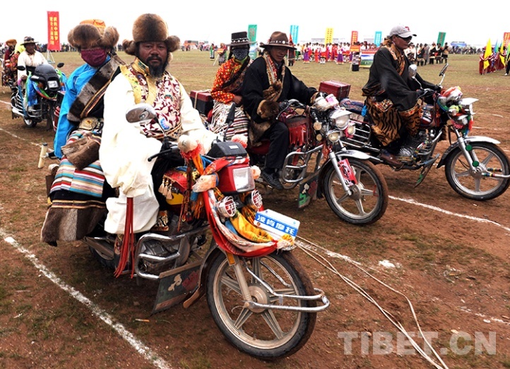 這是在雙湖縣慶祝建縣儀式上,著盛裝的牧民摩托車車隊(duì)正在通過(guò)主席臺(tái)(唐召明2013年7月26日攝)