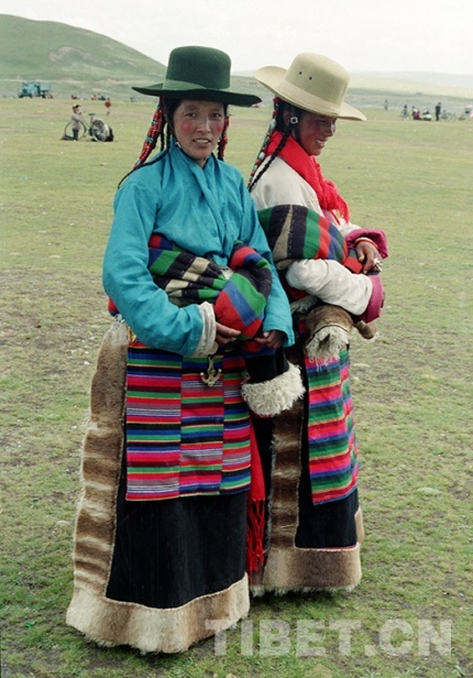 這是在藏北首府那曲鎮(zhèn)賽馬會(huì)上,兩位參加草原盛會(huì)的盛裝牧女(唐召明1987年夏攝)