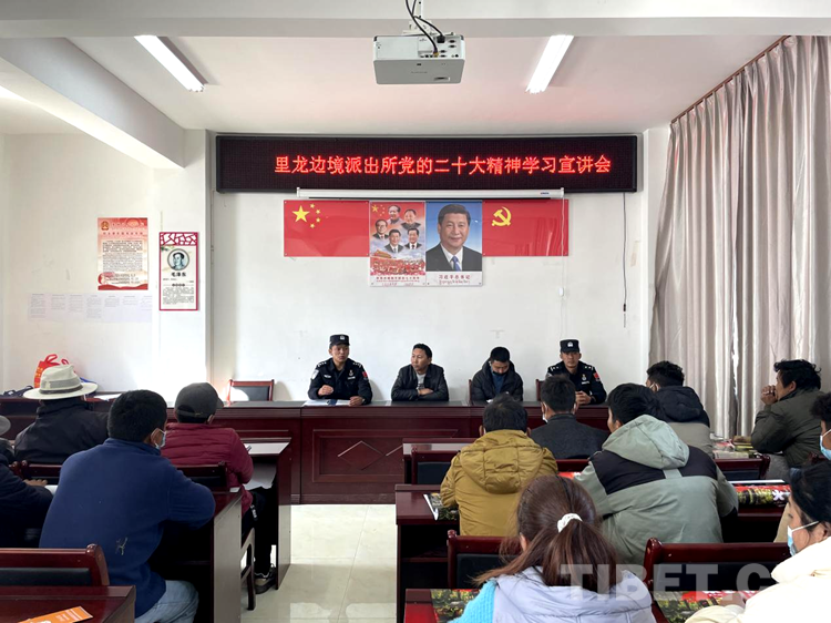在林芝邊境管理支隊里龍邊境派出所玉松村的黨群活動中心,民警們宣講著黨的二十大報告精神熱點,普布老人和群眾們聽著黨的“好聲音”臉上露出了燦爛的笑容。