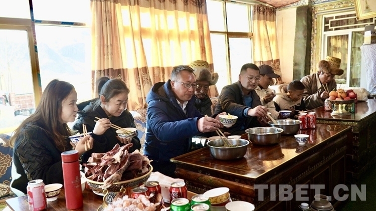 “這些干部和我們相處了這么長時(shí)間,都成自家人了。他們家在內(nèi)地,但因?yàn)楣ぷ鞅仨殘?jiān)守崗位。我們能做的也不多,就是請(qǐng)他們到家中來吃個(gè)簡單的團(tuán)圓飯。” 多章說著,老人的女兒央金熱情地端來酥油茶。