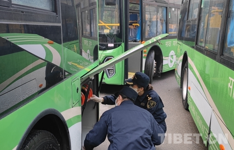 圖為拉薩海關(guān)所屬聶拉木海關(guān)監(jiān)管驗(yàn)放出口國產(chǎn)新能源公交車 由拉薩海關(guān)供圖