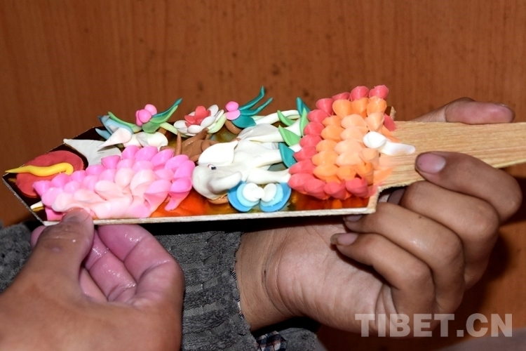 “酥油花手藝是我爸爸教給我的,然后我的弟弟、兒子的手藝是我教給他們的。去年年前一個月內(nèi),去掉其他開銷,我一個人賺了一萬多?!彪m然這活累了點兒,但在農(nóng)閑期間能有這樣一筆收入,對旦增家來說很可觀。