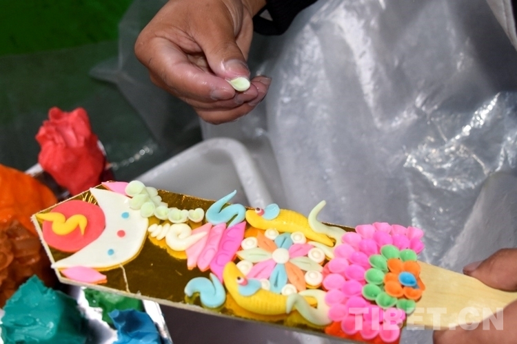 “我們一般在藏歷新年前20天左右到達拉薩。買酥油,和礦物染色原料調(diào)至成泥狀后便開始捏制。”旦增說,普松鄉(xiāng)有制作酥油花的傳統(tǒng),每年藏歷新年臨近,他們便結(jié)伴來到拉薩制作酥油花銷售。