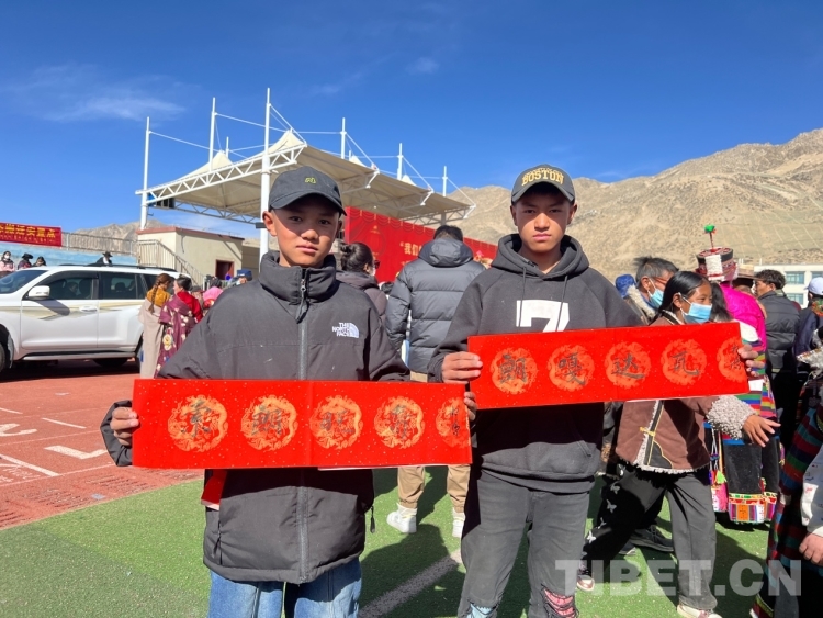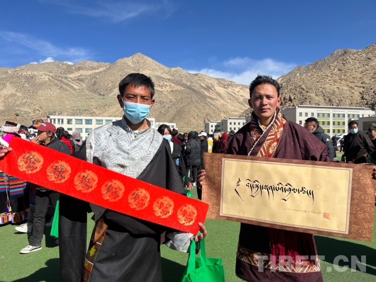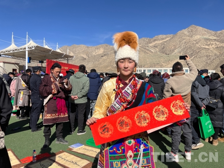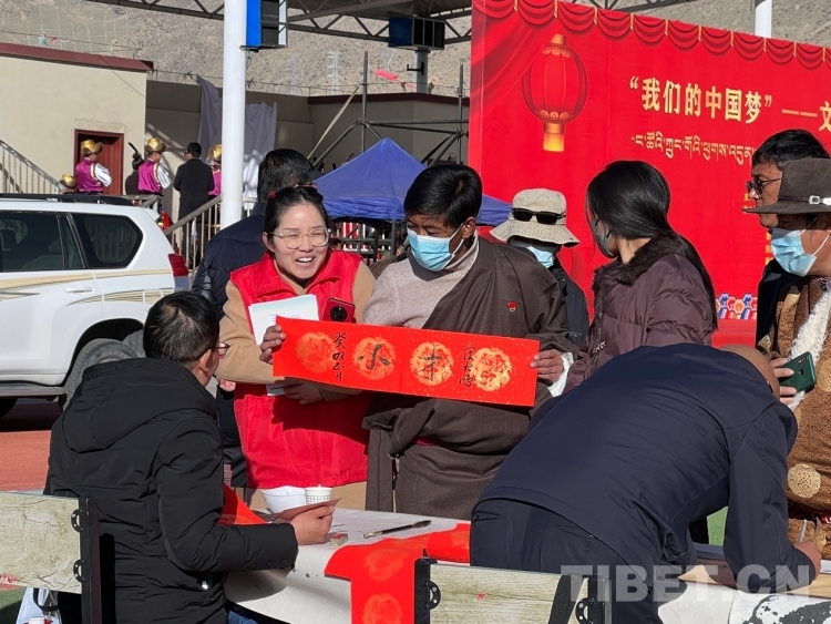 中國西藏網(wǎng)訊 2月16日,西藏自治區(qū)文聯(lián)主辦的“我們的中國夢”——文化進萬家活動在極高海拔生態(tài)搬遷安置點開展。在送“書法”現(xiàn)場,由西藏書法協(xié)會和山南市11位書法家為當(dāng)?shù)厝罕娝腿?00多張寓意美好的新年祝福和群眾期望的新年祝愿等?;顒蝇F(xiàn)場群眾絡(luò)繹不絕,大家心滿意足地拿著書法家為自己贈送的精美“禮品”。一旁書法家們忙碌地為群眾書寫祝詞,另一旁群眾們晾曬著他們得到的書法作品,一時間現(xiàn)場成了“書法展”,時不時地有人前來參觀欣賞。(中國西藏網(wǎng) 記者/德吉卓瑪)