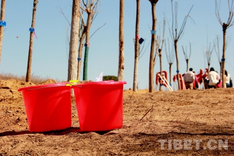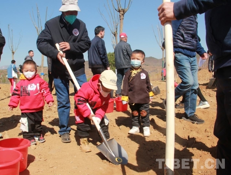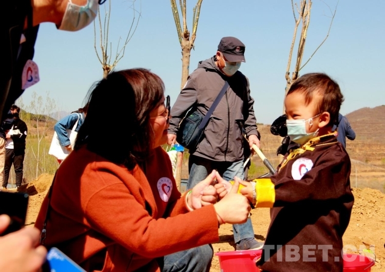 來(lái)自青海省果洛藏族自治州的多杰雖然才3歲多,但在掌握了鐵锨的使用后,他就成了整個(gè)植樹區(qū)域的熱心人,到處幫助別人鏟土,樂此不疲。圖為多杰正在幫助別人鏟土植樹 攝影:劉莉