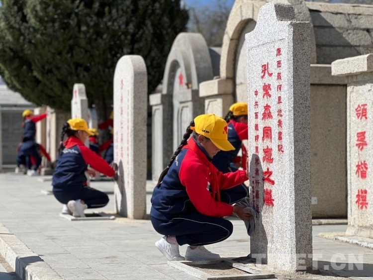 圖為學生們擦拭革命先烈的墓碑 攝影:德吉卓瑪