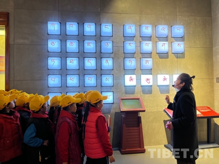 走進(jìn)“藏地智慧”,學(xué)生們一眼認(rèn)出藏文創(chuàng)始人吞彌·桑布扎,大家異口同聲回答講解員的問(wèn)題說(shuō):“這是吞彌·桑布扎?!钡玫街v解員的肯定、并向他們講述背后的相關(guān)歷史后,學(xué)生們聽(tīng)得很入迷,也更有信心面對(duì)接下來(lái)的問(wèn)題。藏文的信息化使得這一古老文字煥發(fā)著全新而旺盛的生命力,在這里學(xué)生們欣賞藏文在智能手機(jī)、電腦、多功能點(diǎn)讀機(jī)等智能電子設(shè)備內(nèi)“走動(dòng)”、傳統(tǒng)農(nóng)牧業(yè)的模擬場(chǎng)景和現(xiàn)代化的機(jī)械設(shè)備圖、藏醫(yī)藥材、藏香藏紙制造和制鹽過(guò)程等獨(dú)具特色的藏族傳統(tǒng)手工藝,也能很好的回答講解員提出的問(wèn)題,現(xiàn)場(chǎng)互動(dòng)氣氛熱烈?!斑@種活動(dòng)我們學(xué)校不會(huì)常有,當(dāng)孩子們聽(tīng)到要去拉薩時(shí)像是要過(guò)年那樣高興,一路上問(wèn)這問(wèn)那地充滿好奇?!倍喟奏l(xiāng)小學(xué)的帶隊(duì)老師羅珍介紹:“這次參加活動(dòng)的這些學(xué)生都是三、四、五年級(jí)的學(xué)生,個(gè)個(gè)品學(xué)兼優(yōu)?!?/p>