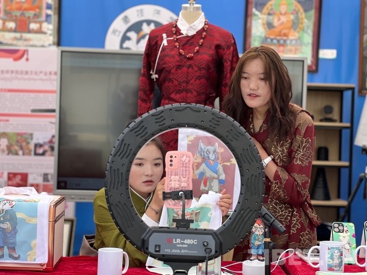 在展示交流區(qū),兩名穿著藏裝的姑娘正在通過直播向觀眾介紹有十二生肖圖案的被子、手機殼、筆記本等各類產(chǎn)品,也吸引著現(xiàn)場嘉賓前來參觀?!斑@些作品是民族文化產(chǎn)業(yè)系學生的作品,圖案都是學生自己繪畫的原創(chuàng)文創(chuàng)產(chǎn)品?!蔽鞑丶紟煂W院數(shù)字信息產(chǎn)業(yè)系教師桑珍介紹,“兩位姑娘是21級電商專業(yè)學生,通過這次活動一方面希望自己得到鍛煉,另一方面也是為7月份的電商大賽做前期的培訓。”