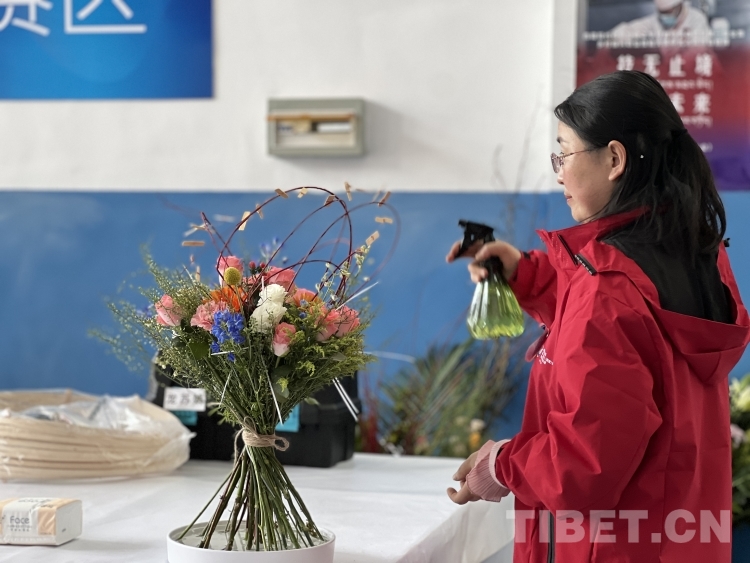 圖為林芝市職業(yè)技術(shù)學校職工組選手龍?zhí)K娟對自己的花藝作品進行噴水保鮮 攝影:德吉卓瑪