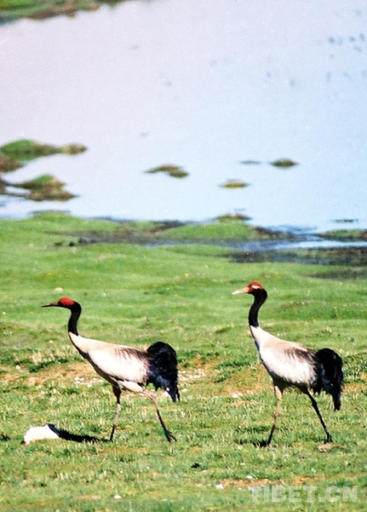 這是兩只漫步在藏北色林錯國家級自然保護區(qū)的國家一級保護動物、被稱為“鳥類熊貓”的黑頸鶴(唐召明2001年攝)