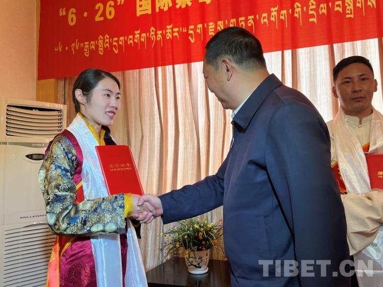 圖為相關(guān)領(lǐng)導為西藏禁毒達人頒發(fā)榮譽證書 攝影:德吉卓瑪