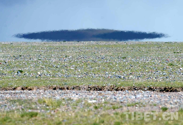 出現(xiàn)在羌塘國家級自然保護區(qū)的形似飛碟的海市蜃樓。海市蜃樓是因空氣中不斷升騰的水汽將光線折射而形成(唐召明2009年8月2日攝)
