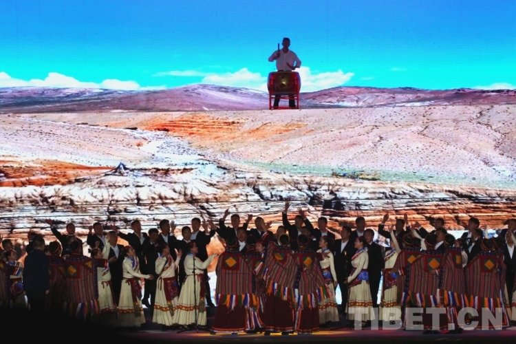 隨后盛大的開幕式文藝演出如期而至。演出共分為《悠遠古韻》《詩意微芒》《如炬經(jīng)典》《輝煌盛世》四個篇章?!队七h古韻》篇章為大型情景表演,結(jié)合古格壁畫為開場表演,展現(xiàn)出阿里人民群眾的精神面貌和獨特的阿里神韻?!对娨馕⒚ⅰ穮R集阿里地區(qū)諸多極具代表性的國家級非物質(zhì)文化遺產(chǎn)節(jié)目,展現(xiàn)阿里地區(qū)悠久燦爛的古代文明遺存?!度缇娼?jīng)典》篇章通過不同舞蹈,展現(xiàn)阿里獨具特色的民間歌舞文化?!妒⑹老腋琛穭t展現(xiàn)了阿里地區(qū)以熱情昂揚的姿態(tài)在全力以赴推動建設(shè)雪域高原“西部明珠”中取得的一系列可喜的成績。