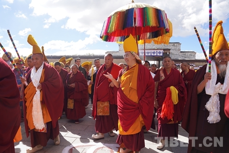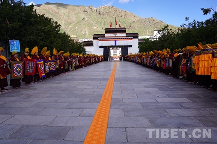 當(dāng)天,扎什倫布寺裝扮一新,寶頂流彩,金碧輝煌,寺院大門前信眾摩肩接踵翹首以盼,通往寺廟大殿的道路兩側(cè)僧眾比肩而立列隊(duì)歡迎,整個(gè)寺院沉浸在祥和、莊重、熱烈的氣氛中。