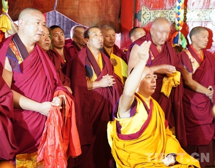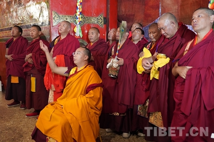 當(dāng)日下午,在扎什倫布寺拉讓日光殿,班禪登上法座,接受扎什倫布寺管委會僧人成員、高僧朝拜,為他們摸頂賜福,并帶領(lǐng)高僧誦經(jīng)祈福。