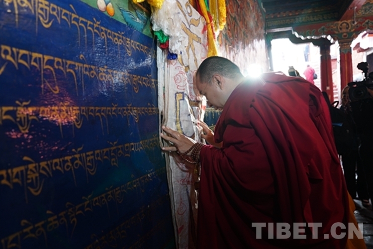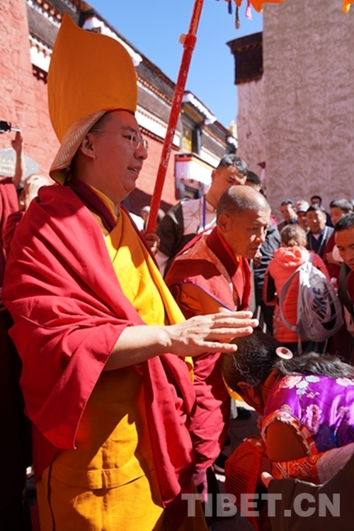 在朝拜過程中,班禪數(shù)度憑欄駐足,向信眾、游客揮手致意,并兩次為信教群眾摸頂賜福。